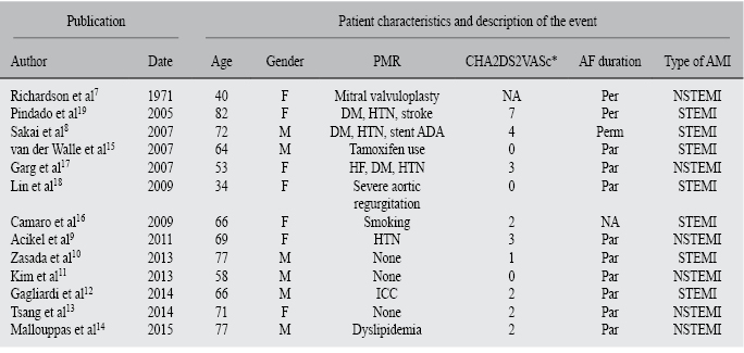 PMR = Past medical record, AF = Atrial fibrillation, ASA = Acetylsalicilic acid, DM = Diabetes mellitus; HTN = Hypertension, HF = Hypertension, Per = Persistent, Perm = Permanent, Par = Paroxysmal, STEMI = ST segment myocardial infarction, NSTEMI = Non ST elevation myocardial infarction, NA = Information not available, PMR = Past medical record.