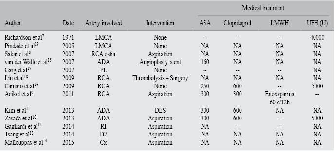 A total of 13 case reports of coronary embolism associated with AF were identified (each one with only one patient) (Table I); the first of these cases was reported in 1971 with the rest of them being reported over the last two decades.7 The mean age of patients was 63.8 ± 13.7 years, with an equal distribution of men and women. In 9 patients AF was paroxysmal, 2 patients had persistent and only 1 had permanent AF; one case report did not establish AF duration. When assessing embolism risk, most patients had a significant risk (including a patient with CHA2DS2VASC score of 7 and another patient with history of rheumatic valvulopathy and mitral valvuloplasty), with just 3 patients with a CHA2DS3VASC score of 0 and one patient with score of 1. In 7 patients (53.8%), the acute coronary event was classified as an ST segment elevation AMI (STEMI). Most case reports agree on the use of anticoagulants and anti-platelet aggregation therapy (dual in some cases) as an initial treatment. In 53.8% of the cases, thrombus aspiration was used as the initial reperfusion strategy, achieving an excellent angiographic result;8-14 two patients had angioplasty with stent implantation due to fragmentation and distal thrombus embolism15 or inability for thrombus aspiration due to its large size.11 In another 2 cases, the distal localization of the occlusion precluded any intervention (Table II).16,17 In one case the patient was treated unsuccessfuly with thrombolytics; this patient was taken posteriorly to aortic valve surgery due to severe regurgitation without any description of whether or not coronary artery revascularization was performed during the same operatory act.18 In the case reported by Pindado et al,19 the patient was not intervened. This patient had an anomalous origin of his left coronary artery, arising from the right Valsalva sinus, with total occlusion of left coronary trunk and contained ventricular rupture; the patient presented with cardiogenic shock and finally died during the index hospitalization.19