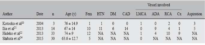 Fem = Female sex, HTN = Hypertension, DM = Diabetes mellitus, CAD = Coronary artery disease, NA = Information not available, LMCA = Left main coronary artery, ADA = Anterior descending artery, RCA = Right coronary artery, Cx = Circumflex artery.