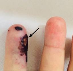 A 37-year-old man, previously healthy, with no history of contagious infectious disease and cardiovascular disease. He is from the State of Mexico, with history of intravenous opioids use (tramadol) 7 times per week, for chronic lower back pain secondary to lumbar herniated disc of one year of progress. The clinical condition started while he was driving, with sudden alteration of alertness manifested by disorientation, drowsiness and aphasia, their relatives observed it so that he was transferred to a private hospital. Upon admission, he remained disoriented. The physical examination is notable for a IV/VI holosystolic murmur over the apex radiating to the axilla. There were painful, nodular, erythematous, skin lesions localized in the pads of the fingers, as well as small, painless, flat spots, red to bluish red on the palms and soles [Osler’s nodes (Figure 1) and Janeway’s lesions (Figure 2)]. The rest of the physical and neurological examination did not present abnormalities. He was admitted to the Medical Center «20 de Noviembre» with fever of 38 oC, breathing rate of 24 rpm, heart rate of 115 bpm, blood pressure 100/60 mmHg. Fluid therapy and empirical antibiotic therapy were started (vancomycin and ceftriaxone). Initial laboratory test results with complete blood count indicating leukocytes of 23,000 mm3, platelets of 108,000 mm3, blood creatinine of 1.3 mg/dL, the rest remained unchanged. Blood cultures were negative. Cranial tomography (cranial CT) without evidence of areas of ischemia or hemorrhage. We proceeded to do a lumbar puncture and the cerebrospinal fluid (CSF) analysis showed cloudy fluid, glucose of 32 mg/dL, proteins of 165 mg/dL, leukocytes of 1760 and lymphocyte of 0. The CSF culture result was isolation of Staphylococcus aureus at 72 hours. The report of the transthoracic echocardiogram was: a structurally normal mitral valve, maximum gradient of 6 mmHg, medium gradient of 3 mmHg, with maximum velocity of 1.2 m/s, with a jet of severe regurgitation, reaching the left atrium roof. Maximum velocity of the jet of 4.4 m/s, with a suggestive image of a vegetation on the anterior leaflet. The transesophageal echocardiogram showed no thickened valves, with a vegetation of 1 × 0.9 cm-sized vegetation on the anterior leaflet, in segments 1 and 2, which oscillated during the cardiac cycle, with a filiform appendix adhered to the distal end of the vegetation (Figure 3), that affected the severe regurgitation jet which was visualized along the lateral wall of the atrium. Vital signs remained stable within the course; however, 72 hours after, he presented decreased alertness of less than 8 points of the Glasgow scale, with respiratory failure requiring advanced airway management and mechanical ventilation, entering the intensive care unit. Due to persistent hemodynamic instability and high-risk of embolism 5 days after entering, he required surgical intervention with valve replacement. He did not present post-surgical complications. Due to clinical state improvement, he was extubated 72 hours after surgical intervention, with no neurological sequela and without cardiac failure, data that might be frequent complications of this disease. Clinically this case meets the modified Duke criteria for clinically infective endocarditis due to the presence of vascular lesions and embolic phenomena, cultures with the presence of Staphylococcus aureus isolated from cerebrospinal fluid and the presence of a vegetation on the echocardiogram.