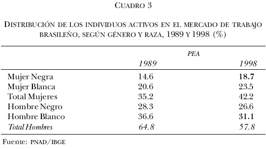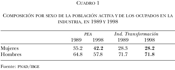 Tomando datos para el periodo comprendido entre 1989 y 1998/ 1999, y recurriendo a la más amplia encuesta domiciliaria brasileña, la Pesquisa Nacional por Amostra de Domicilios (PNAD), se ve una curiosa permanencia en lo que respecta a las desigualdades: la industria aún es esencialmente masculina y blanca, incluso después de los últimos 10 años de intensa reestructuración, en los que se alteró mucho el perfil del trabajador "sobreviviente".3