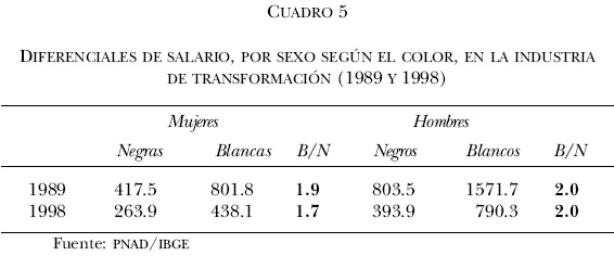 Tal como se puede verificar en el cuadro 5, importantes diferenciales de rendimientos separan a negros y blancos, sean hombres o mujeres. Un trabajador o trabajadora industrial, si es blanco(a), recibe por lo menos 1.7 veces el rendimiento medio de un trabajador o trabajadora industrial negro(a). Y si la distancia comprendida en esa razón parece reducirse entre las mujeres (pasando de 1.9 en 1989 a 1.7 en 1998), ésta permanece inalterada (e inalteradamente la más alta) entre los hombres: si son blancos, ellos perciben por el trabajo industrial dos veces más, en promedio, que si fueran negros.8
