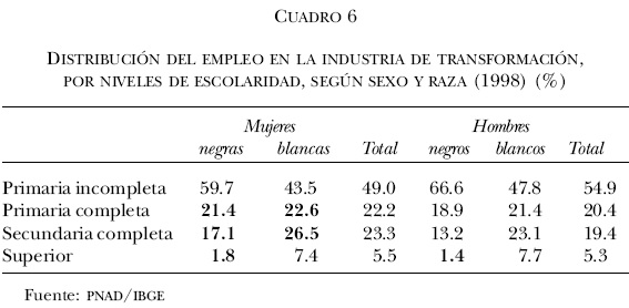 Ahora bien, si hubo un sector, en el mundo del trabajo en Brasil, donde esa nueva cultura normativa hizo furor (hasta porque ahí se originó) ese sector fue la industria. No sería, pues, impertinente indagar qué es lo que pasa con la población que concurre al mercado de trabajo, y particularmente con los trabajadores industriales, en los años de intensa y reciente reestructuración, si los observamos bajo el prisma de las diferencias de incorporación de negros y de mujeres. ¿Se reestructuran las desigualdades?, y ¿en qué dirección?