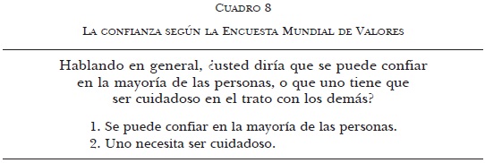 Es preciso recordar que la desconfianza no constituye simplemente la falta de confianza. De aquí que sea también importante considerarla propiamente y en sus diferentes dimensiones. Como puede observarse en el siguiente cuadro, la Encuesta Mundial de Valores parece asumir el primer punto; pero en este caso su pregunta tiene como referente la confianza calculada, basada en el principio de reciprocidad.