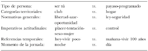 En una primera lectura de las canciones, encontramos al menos seis códigos disyuntivos que nos dibujan dos mundos contrarios: