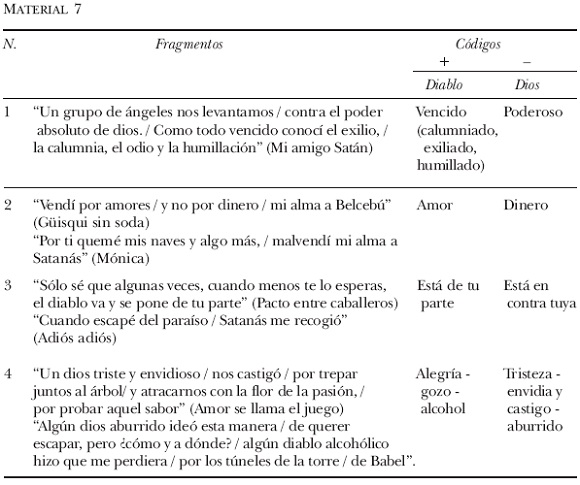 En el transcurso del artículo hemos querido mostrar cómo funciona el Método de Análisis Estructural de Contenido frente a materiales empíricos, concretamente el discurso de Joaquín Sabina, y cuál el uso que se le puede dar para la interpretación de fenómenos sociales globales. Es claro que, metodológicamente, esta operación se puede realizar con cualquier material, incluso con imágenes, fotografías, literatura, comportamientos, etcétera, siempre que sean cuidadosamente seleccionados. Toda producción cultural tiene por detrás una estructura subyacente que puede ser decodificada si se sigue el camino apropiado.