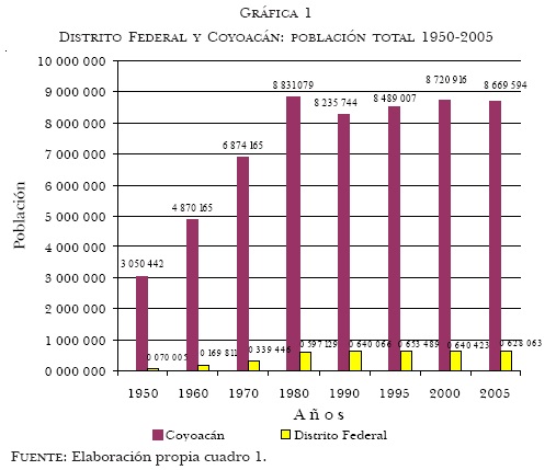 En la reconfiguración de la delegación Coyoacán convergen estos aspectos que se expresan en la apropiación del espacio local para usos y funciones predominantemente habitacionales. De manera paralela, se desarrollan proyectos urbanísticos de carácter público, que se materializan en conjuntos plurifamiliares de vivienda de interés social, en la expansión de la infraestructura vial, de abasto, de salud y de educación pública. Se distingue la creación de sedes de funciones educativas y culturales a nivel medio y superior, de alcance regional en la ciudad y en el país. Éste es el caso de la Universidad Nacional Autónoma de México (1953), en el sur poniente de la delegación, que traslada a este espacio local actores, actividades y prácticas socioculturales previamente concentrados en el centro histórico de la entonces ciudad interior. Estos cambios en la fisonomía urbana están estrechamente asociados al acelerado crecimiento demográfico en el Distrito Federal, impulsado por el fenómeno migratorio rural-urbano e intraurbano. En Coyoacán éste es el principal generador del incremento ocurrido entre 1940, cuando habitaban la delegación 35 248 personas, en su mayoría concentradas en aproximadamente la quinta parte del territorio actual, y 1980, año en que la delegación registra cerca de 600 000 habitantes en un espacio completamente urbanizado (Ramírez, 2007).