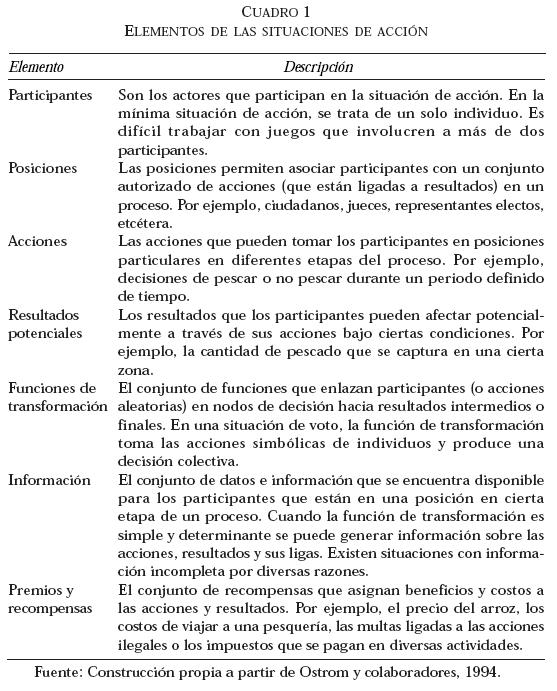 Como se indicó en secciones anteriores, las situaciones de acción tienen participantes que se encuentran en posiciones y que deben decidir entre diferentes acciones a la luz de la información que poseen acerca de cómo las acciones están ligadas a resultados potenciales y a los costos y beneficios asignados a las acciones y resultados.