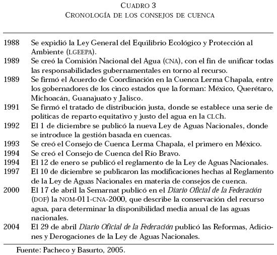 Estas comisiones de cuenca vivieron su apogeo durante los años cincuenta y sesenta, hasta su desaparición a finales de los años setenta. Los rezagos del sector hidráulico y los problemas de escasez y contaminación se fueron haciendo más notorios a finales de los años ochenta, de tal forma que fue necesario establecer una serie de acciones (Castelán, 2000; Wester, Melville y Ramos, 2001). El cuadro 3 presenta una breve cronología de los consejos de cuenca: