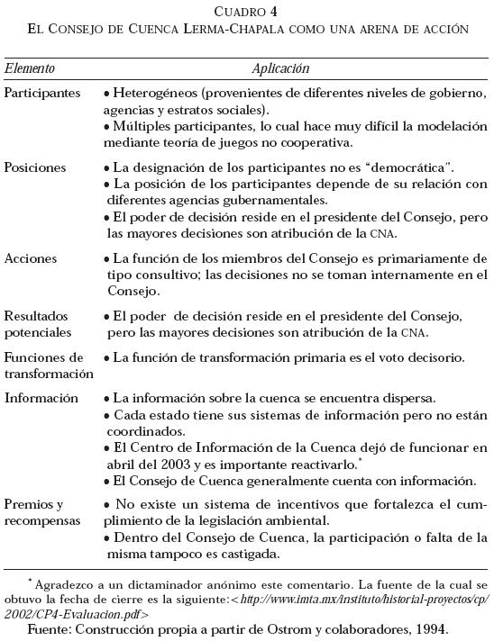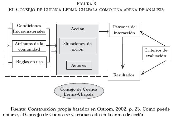 El modelo de Análisis y Desarrollo Institucional desarrollado por Ostrom y sus colaboradores (Ostrom, 1999; Pacheco, 2005) establece un marco organizado que permite estudiar en detalle la interacción de una serie de elementos de gran relevancia en la estructuración de las acciones de política pública. El estudio de las instituciones robustas para el manejo de los recursos naturales ha sido utilizado por Leticia Merino en el análisis de las formas en las cuales se crea capital social para la gestión sostenible de los bosques en México (Merino, 2004), y en el estudio de la gestión del recurso hídrico con un particular enfoque en la Cuenca LermaChapala por Sergio Velázquez, Flip Wester y Eric Mollard (Vargas, 2003; Wester et al., 2001). Sin embargo, en el área de la política de tratamiento de aguas residuales, no hay referencia de aplicaciones anteriores de análisis institucional a este problema, y específicamente al papel del Consejo de Cuenca LermaChapala en materia de saneamiento. Los estudios del CCLCh se han enfocado típicamente al análisis de los conflictos en materia de distribución de agua (Boehm et al., 2002; Caire, 2004; Castelán, 2000), no a los asuntos de saneamiento y calidad del agua residual.
