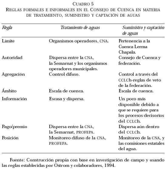 En el cuadro 5 se presentan los cinco tipos de reglas que se encontró que tenían importancia en la gestión de las aguas residuales en la Cuenca LermaChapala. Las reglas formales incluyen la autoridad, el ámbito y el pago/premio. Como se puede derivar del cuadro 5, la regla de pago/ premio es todavía muy dispersa entre las diferentes agencias gubernamentales en México. La regla de autoridad está escrita en la LAN, pero en la realidad es sumamente difusa. Las reglas de agregación, información y posición son reglas relativamente informales y, como se puede observar, también son sumamente difusas.