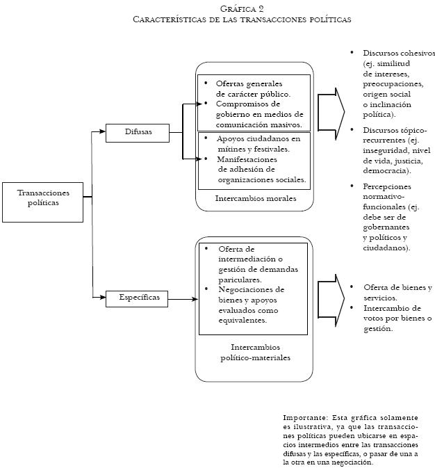 Las relaciones clientelares no están generalizadas ni abarcan todo el espectro de estrategias mediante las cuales los partidos buscan allegarse votantes en la ciudad de México, aun cuando sean las que tienen mayor efecto en las preferencias electorales. Esto no es nuevo, pero sí lo es que dichas relaciones requieren, cada vez más, de eficiencia. Los contenidos morales que respaldan las adhesiones están siendo sustituidos por el pragmatismo individualista, lo cual podría explicar el incremento de los swings (oscilaciones) en las preferencias políticas mostradas en algunas secciones electorales en la ciudad de México.24 El incremento en la competencia partidaria también implica una creciente disputa por las clientelas, lo cual, como se muestra posteriormente, modifica su cultura y sus estrategias proselitistas. Esto se expresa, como se ilustra en la gráfica 2, en las relaciones frente a frente entre políticos y ciudadanos a través del desplazamiento de las transacciones difusas (impregnadas de intercambios morales), donde se hacen ofertas generales acompañadas de discursos cohesivos, tópicorecurrentes y percepciones normativofuncionales, por las transacciones específicas (caracterizadas por intercambios políticomateriales), donde la intermediación por bienes y servicios se intercambia por votos y apoyo político.