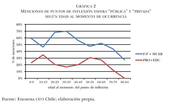 Comparativamente, parecería que la esfera privada y la pública articulan las biografías de forma "inversa" hasta el decenio de los 60-69 años; así, en la etapa formativa la importancia de la esfera privada decae en menciones, y en la etapa de formación familiar la esfera pública disminuye a niveles estables de menciones entre 16% y 20%; situación similar sucede en el periodo hacia el retiro laboral, punto a partir del cual las menciones sobre el ámbito privado y público disminuyen a sus niveles más bajos; al final de la vida sólo se presentan como relevantes los cambios relacionados con la esfera privada.