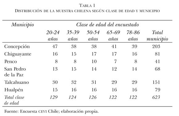 La recolección de los datos chilenos fue realizada principalmente por estudiantes de Sociología de la Universidad de Concepción. Se desarrolló a partir de un muestreo no aleatorio, con características de bola de nieve para el acceso a los casos requeridos en cada clase de edad. La muestra lograda fue de 623 casos (tabla 1), los cuales, en términos generales, tienen un nivel educacional mayor que el presentado por la población considerada.