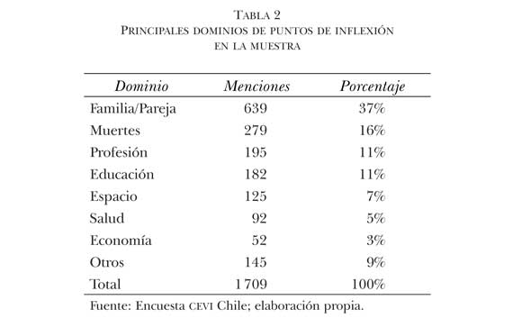 En la tabla 2 se puede apreciar que los chilenos reconstruyen su biografía principalmente en relación con el dominio familiar y afectivo; de esta forma, las menciones a eventos de tipo familiar/pareja y eventos sensibles como la muerte de otras personas corresponden a más de la mitad de las menciones (53% entre ambos) de todos los puntos de inflexión reportados.