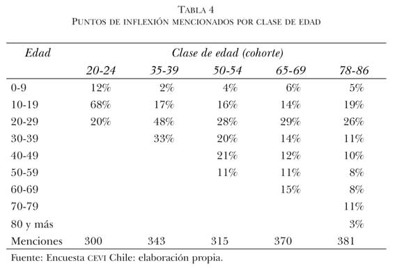 Finalmente, si consideramos las menciones sobre los últimos tres segmentos de edad a los cuales podían referirse los encuestados(periodo comprendido entre 60 y 84 años), este segmento aparece como el periodo que posee menos referencias a puntos de inflexión, lo que en parte se puede explicar porque sólo una parte de la muestra puede referirse a este periodo; sin embargo, también este porcentaje permitiría esperar un nivel de menciones mayor del 9% que existe para todo este periodo; por lo tanto, consideramos pertinente caracterizarlo como de retiro de la vida activa, no sólo laboral, sino también socialmente, pues parece que los eventos en esta etapa de la vida no tienen la misma relevancia de los eventos ocurridos en etapas anteriores.