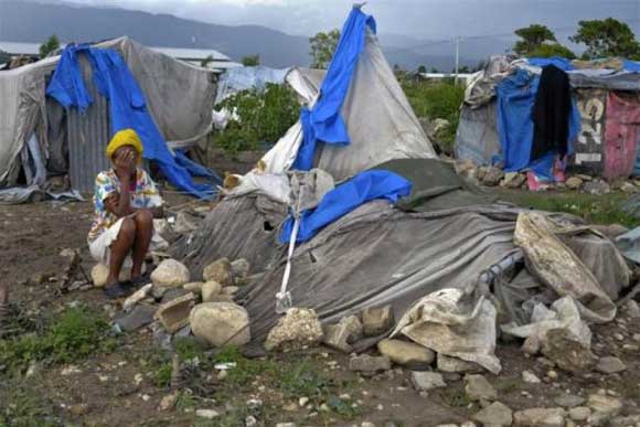 Campamento en Haití. Mujer haitiana se lamenta por una tienda