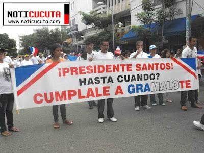 En Colombia, las calles de Cúcuta fueron tomadas el 17 de abril de 2012 por más de 2000 personas que realizaron una multitudinaria marcha para exigir al gobierno nacional que acelere el proceso de reconstrucción del casco urbano de Gramalote, pues consideran que durante este año no ha tenido ningún avance. Con pancartas, arengas y consignas, los gramaloteros recorrieron las principales calles de la capital nortesantandereana, desde el sector de Cerro Pico, en la populosa ciudadela de Juan Atalaya, hasta la sede de la Gobernación, donde se reunieron con el mandatario seccional, a quien le pidieron intervenir ante el gobierno central "para que el reasentamiento del pueblo no se quede en palabrería" (Gramalote Vive, 2012). (imagen 2)