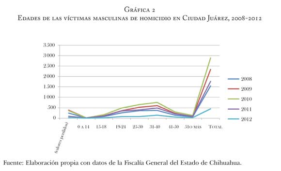 De 2008 a 2011 se registraron más de 10 000 asesinatos violentos en Ciudad Juárez; 400 correspondieron a mujeres, mientras que 95% de las víctimas fueron hombres, en su mayoría jóvenes. El término juvenicidio, si bien se ha empleado para nombrar el asesinato mayoritario de jóvenes en el país, pierde de vista las especificidades de aquellos que han sido víctimas del combate al crimen organizado y de las políticas de seguridad, pues son hombres que corresponden a sectores barriales y vinculados con clicas o gangas juveniles;[2] a la mayoría se les atribuía participación en actividades delictivas. Sus características coincidentes eran ser hombres, pobres y estigmatizados, como los llamados cholos.