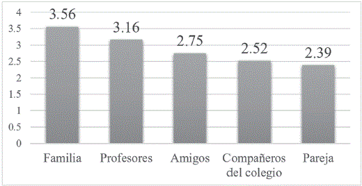 El origen social tampoco representó una desventaja en la influencia para la toma de decisiones de los egresados sobre su proyecto de vida. Al indagar sobre el papel que tuvo la red de relaciones de los egresados en este aspecto, específicamente la influencia en la decisión de continuar con la educación superior al terminar la secundaria, se encontró que las redes familiares jugaron un papel significativo en el encauzamiento hacia la continuidad de la formación, con un índice de influencia de 3.56 en una escala de 1 a 5,2 es decir, la familia, independientemente de su nivel de logro educativo, logró influir positivamente a los egresados para la obtención de credenciales útiles en el acceso a mejores puestos de trabajo, con mejores ingresos y el relacionamiento con nuevos grupos sociales; además, otras redes de apoyo, como profesores del colegio, también configuraron una inspiración para seguir estudiando, con un índice de influencia de 3.16 (ver gráfica 1). Al igual que en otros estudios, estos hallazgos confirman que las redes sociales, en tanto conjunto de actores unidos por vínculos y relaciones sociales, logran tener influencia para orientar las acciones de los egresados mediante la socialización de información o inversión en tiempo y conocimiento, es decir, el apoyo para seguir estudiando (Bertolini y Goglio, 2016); los vínculos de familiares y amigos más cercanos son especialmente importantes en la toma de decisiones como entrar al mercado laboral o seguir estudiando (Huerta y Berumen, 2014).