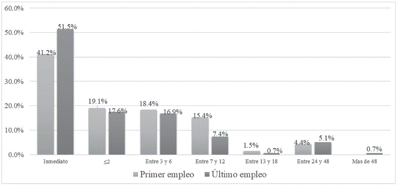 Para el caso del último empleo, en cambio, aunque siguen siendo los contactos el medio por el que más se accede a puestos de trabajo, con un índice de frecuencia de 2.63, se observa que aumenta la participación de los vínculos débiles, recibiéndose más información por parte de colegas y anteriores empleadores, y la aplicación directa incrementa en la frecuencia de uso, pasando de 2.07 a 2.37 (ver gráfica 6). De acuerdo con Granovetter (1995), esto se explica en razón de que después de la primera incursión en el mercado laboral, la red de contactos más lejana, conformada por compañeros de trabajo y anteriores empleadores, entre otros, se vuelve más efectiva para la movilidad ocupacional, dado que gran parte de la información del mercado laboral se transmite más cuando se participa en él que cuando se está buscando trabajo por fuera del mismo, pues se generan espacios como encuentros casuales, reuniones de trabajo, tareas compartidas, entre otros; estos espacios son un factor que activa o facilita el flujo de información, en la medida en que posibilitan el mantenimiento y la obtención de nuevas relaciones con otros actores, es decir, la configuración de nuevos vínculos débiles. Además, la primera incursión en el mercado laboral mejora la cualificación profesional de los egresados y posibilita la adquisición de experiencia, logrando así que se cuente con un mayor reconocimiento profesional que se convierte además en un recurso útil para la movilidad ocupacional intrageneracional, es decir, para la mejora de sus ondiciones ocupacionales, mejores puestos de trabajo en el ejercicio de su profesión que posibiliten su movilidad por diferentes grupos sociales (Viáfara López, 2017), rompiendo con la dependencia de sus condiciones de origen social (Angulo et al., 2012) en tanto se logra el acceso a empleos de mayor cualificación.
