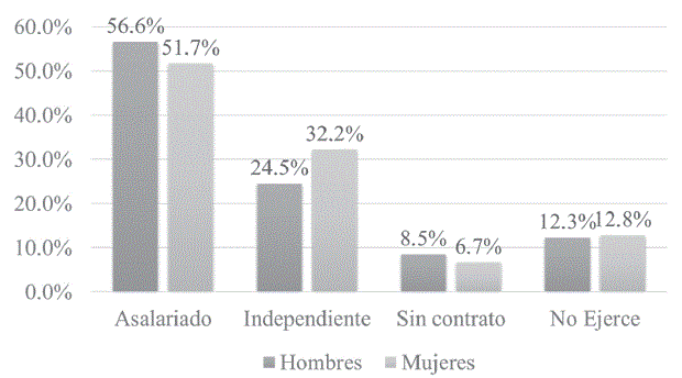 Algunos estudios advierten lo inconveniente de la inserción laboral por medio de vínculos débiles, debido a que han encontrado que tiene lugar principalmente en el segmento secundario del mercado laboral, es decir, empleos de tipo temporal y con malas condiciones de trabajo (Esteban, 2015; Tegegne, 2015), y en otros casos, que su uso no necesariamente implica un mejoramiento en el acceso a empleos de calidad en compa- ración con canales formales (Deguilhem, Berrou y Combarnous, 2019); sin embargo, para el caso estudiado la situación fue diferente, pues se encontró que de los egresados que adquirieron el empleo por medio de contactos, actualmente 93.6% ejerce la profesión en condiciones laborales significativamente estables; del total de los egresados, sólo 12.3% de los hombres y 12.8% de las mujeres expresa no ejercer la profesión y uno de cada dos se ubica dentro de la población que ejerce la profesión como asalariados (ver gráfica 7) con contrato a término fijo e indefinido y lleva más de 2 años laborando en el mismo lugar. Esto da cuenta de que las redes de contactos fueron útiles para lo que Granovetter (1995) describe como la conexión entre el trabajo que se necesita hacer y las personas que están dispuestas a hacerlo o capacitadas para ello, evitando así caer en condiciones de sobre o infraeducación en relación con los puestos de trabajo, donde, por un lado, no se puedan poner en práctica los contenidos aprendidos, y por el otro, no se cumpla con las exigencias necesarias para las tareas que se le asignen. Esto refleja una movilidad ocupacional significativa en relación con sus condiciones de origen, lo que apoya los hallazgos de estudios recientes que muestran la existencia de una movilidad ocupacional intergeneracional significativa en Colombia (Viáfara López, 2017). Adicionalmente, se encontró que un poco más de 65% de estos egresados pone en práctica gran parte de los contenidos aprendidos durante el pregrado, lo que da cuenta de que dichos conocimientos se corresponden con las expectativas existentes en el mercado laboral; por lo tanto, los atributos adquiridos por el egresado durante el proceso de formación, esto es, incremento del capital cultural, le han servido como recurso para moverse en diferentes entornos ocupacionales.