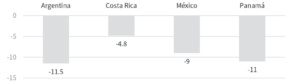 Gráfica 1 Argentina, Costa Rica, México y Panamá: variación proyectada del PIB en 2020 respecto de 2019 (en porcentajes)