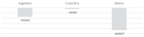 Gráfica 10 Argentina, Costa Rica y México: diferencia interanual de las personas cotizantes, trimestre abril-junio (2020/2019) (en números absolutos)