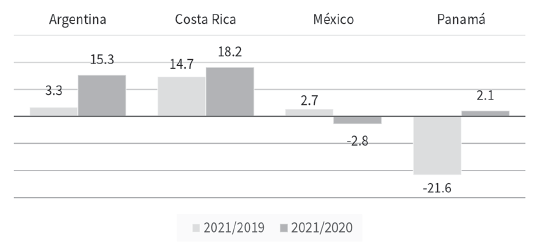 Al analizar la información presentada en el cuadro 2, se advierte que, en términos acumulados hasta abril de 2021, todos los países, con la excepción de Panamá (-21.6), se encuentran en escenarios positivos en términos de la recaudación respecto al escenario base de 2019. Costa Rica alcanzó un máximo de +14.7%; Argentina y México, avances más modestos: 3.3% y 2.7% respectivamente.