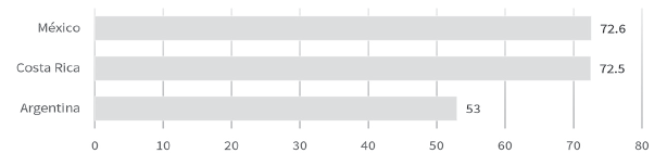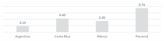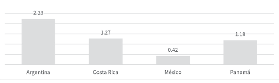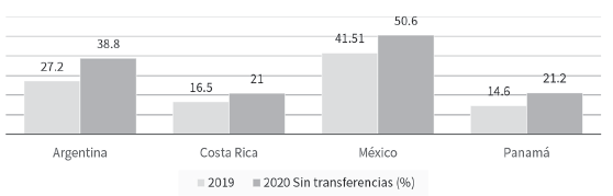 En 2020, sin considerar el efecto de las transferencias monetarias de emergencia, la brecha de pobreza de México en relación con Argentina, medida en puntos porcentuales, se redujo (a 11.8 puntos), pero aumentó frente a Costa Rica (a 29.6 puntos) y en relación con Panamá (a 29. 4 puntos).