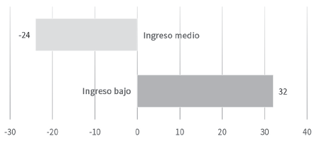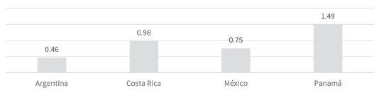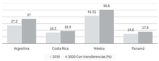 La gráfica 17 muestra que en Argentina, Costa Rica y Panamá las transferencias de ingreso realizadas por sus respectivos gobiernos lograron atenuar estos incrementos; no fue el caso de México, donde este tipo de transferencias no tuvo ningún impacto. Las transferencias lograron reducciones de la tasa de pobreza de 3.6 puntos porcentuales en Panamá, 2.0 puntos en Costa Rica y 1.8 puntos en Argentina.