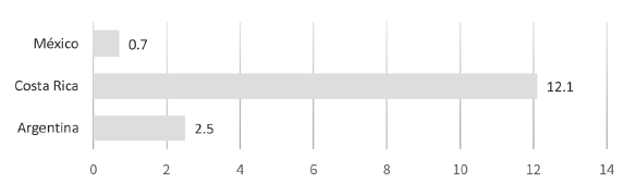 Gráfica 2 Argentina, Costa Rica y México: variación interanual de tasa de desocupación,1 trimestre abril-junio (2020/2019) (en puntos porcentuales)