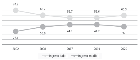 Gráfica 20 América Latina (18 países):1 población según estratos bajos2 y medios3 de ingreso per cápita, 2002-2020 (en porcentajes)