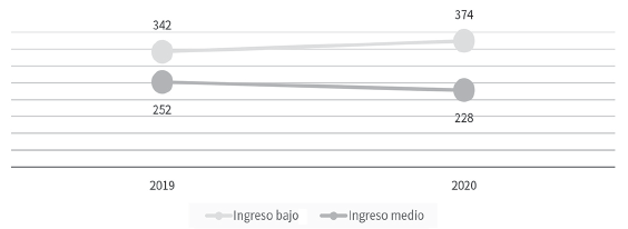 Gráfica 21 América Latina (18 países): 1 población según estratos bajos y medios de ingreso per cápita, 2019-2020 (en millones de personas)
