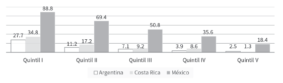 En al, la pandemia llevó a numerosos gobiernos a realizar educación a distancia en todos los niveles educativos, lo que obligó a las familias a contar con conexión a Internet y con dispositivos para que los hijos y las hijas pudieran participar en las labores educativas. Sin embargo, esos recursos se reparten de manera muy desigual. En al, sólo dos tercios de los hogares tienen conexión a Internet. En las zonas urbanas, 46% de los hogares donde hay niños y niñas de 5 a 12 años carecen de acceso a Internet. La gráfica 23 muestra los porcentajes de ese tipo de hogares sin acceso a Internet en Argentina, Costa Rica y México, por quintiles de ingreso.