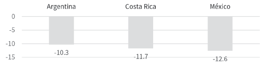 Gráfica 11 Argentina, Costa Rica y México: diferencia interanual de las personas cotizantes, trimestre abril-junio (2020/2019) (en puntos porcentuales)