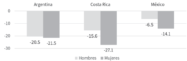La gráfica 4 muestra el impacto de la crisis en el empleo de hombres y mujeres en Argentina, Costa Rica y México, que sistemáticamente fue mayor en el caso de las mujeres. Las brechas fueron más acusadas en los casos de Costa Rica y México: en el primer caso fue de 11.5 puntos porcentuales; en el segundo, de 7.6 puntos porcentuales.15 La población ocupada femenina se redujo 14.1 puntos porcentuales en México, 7 puntos más en Argentina y 13 puntos más en Costa Rica, pero la brecha por sexo fue más acusada en Costa Rica y México, mientras que en Argentina la diferencia fue de sólo un punto porcentual.16