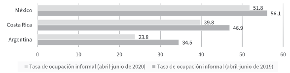 Gráfica 6 Argentina, Costa Rica y México: tasa de ocupación informal, trimestre abril-junio (2020/2019) (en porcentajes)