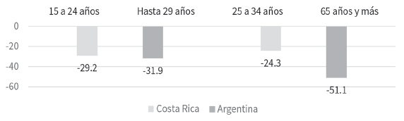 Gráfica 8 Argentina y Costa Rica: variación en la población ocupada por grupos de edad más afectados, abril-junio (2020/2019) (en porcentajes)