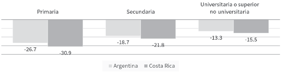 Gráfica 9 Argentina y Costa Rica: Variación en la población ocupada por nivel de educación1 alcanzado, trimestre abril-junio (2020/2019) (en porcentajes)