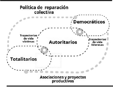 Es posible observar el tránsito de un ámbito en que los arreglos de género se mueven de un modelo autoritario a uno de orden más democrático y liberador, simultáneo a un proceso de empoderamiento que, a partir de las necesidades individuales, genera relaciones más horizontales en las esferas familiares, en la interacción con sus parejas e hijos, y en el orden laboral, transitando hacia ejercicios de conciencia comunitaria y liderazgo asociativo, como escalas locales comunitarias en las que las interacciones y los arreglos de género se transforman hacia escenarios políticos más igualitarios y plurales en los que convergen la política de reparación colectiva y las trayectorias individuales como condición de posibilidad (ver esquema 2 ).