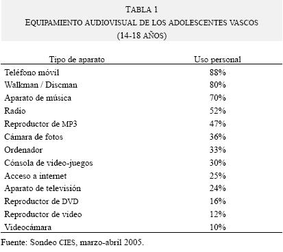 Son significativos los datos del sondeo relativos al equipamiento tecnológico. Los adolescentes vascos disponen de un alto grado de equipamiento, siendo el teléfono móvil la "estrella" entre todos ellos. Llama la atención el hecho de que casi un cuarto de los encuestados disponga de televisión para su uso personal (en su habitación), lo que corrobora la tendencia hacia la individualización del consumo, apuntada tanto en las entrevistas a los expertos como en los grupos de discusión. Los informativos de la televisión son de los pocos programas cuya visión es compartida en el seno familiar. Ello posibilita, además, el contraste de ideas:11