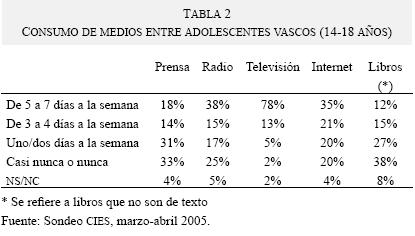 No obstante, manifiestan una actitud muy crítica ante los medios, particularmente ante la falta de objetividad que observan en los programas informativos. Por ello, el discurso de los medios tiene una influencia secundaria en sus opiniones ante cuestiones de actualidad. Ahora bien, en su posición crítica ante determinadas noticias no existe percepción sobre el valor retórico de las imágenes o la fuerza argumentativa del montaje. En este aspecto sí puede hablarse de un estado de importante analfabetismo mediático, algo muy a tener en cuenta, dado que en cuanto al consumo de medios, la televisión es, sin duda, el medio de comunicación más consumido por los adolescentes vascos de entre 14 y 18 años, seguido a gran distancia por la radio e internet. Se observa un creciente uso de la red entre los adolescentes. No en vano 39% de los encuestados dispone en su domicilio de acceso a la red, ya sea este individual o compartido con el resto de la familia. Destaca el pobre consumo de la prensa, así como la baja frecuencia con que estos adolescentes leen libros que no sean de texto.
