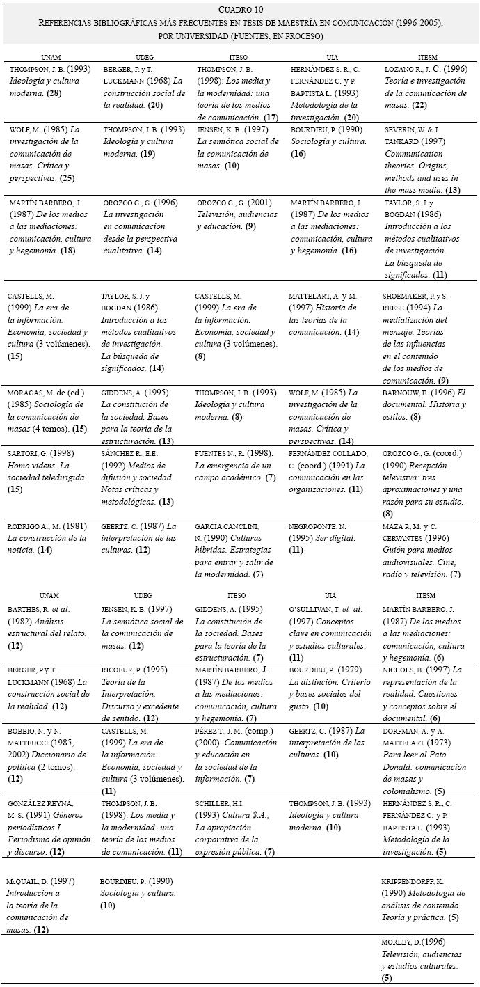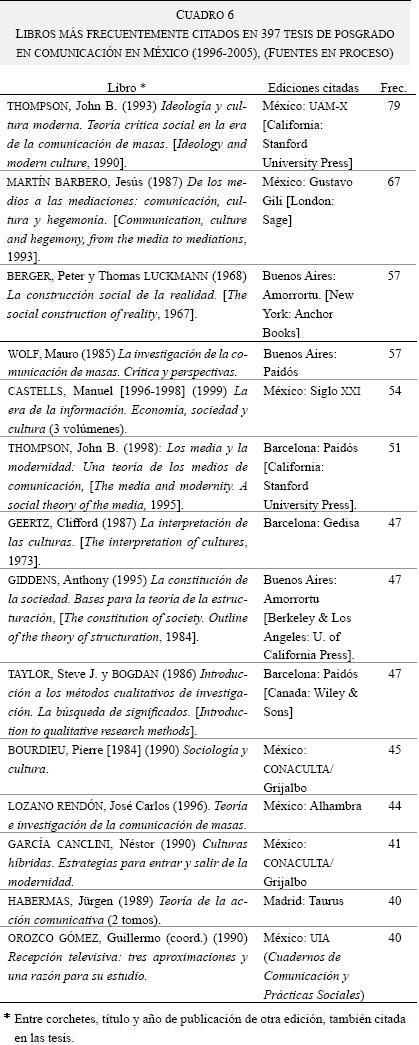Para el caso mexicano, se trabajó con las tesis de maestría de los cinco programas acreditados por el Padrón Nacional de Posgrados de SEP/CONACyT (las maestrías en comunicación de la UNAM, la UIA, la UdeG, el ITESO y el ITESM), y una selección de tesis de doctorado con tema "comunicacional", presentadas en varias universidades mexicanas durante el periodo elegido. Se recuperaron 397 tesis10, en las que se contabilizaron 35,814 referencias (promedio de 179.9 por tesis), de las cuales 17,449 (promedio de 87.7 por tesis), 48.7%, son en sentido estricto referencias bibliográficas (es decir, a libros). La base de datos formada con estas permitió detectar los textos más citados y asociar estas frecuencias con otras variables (como la institución, el año o el tema de las tesis, así como el origen de los libros, su antigüedad o sus características editoriales). Por ahora, conviene solamente hacer mención que de los 9,594 libros citados, sólo 791 están referidos en al menos 1% de las tesis, es decir, en cuatro o más de ellas, y únicamente 14 al menos en 10% (40 o más) de las tesis. Estos últimos se anotan en el cuadro 6.