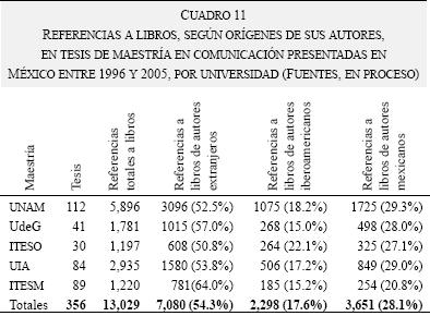 Es probable que el dato más interesante, con respecto a la relación entre programas educativos y fuentes bibliográficas, entre los presentados hasta ahora, sea el indicado en la última columna del cuadro 11: el porcentaje de referencias (más que una cuarta parte del total) que provienen de libros escritos por mexicanos, y que sumadas a las originadas en autores iberoamericanos, representa cerca de la mitad de las fuentes bibliográficas referidas. Aunque esta distribución indudablemente tiene que relacionarse con las temáticas de las tesis para identificar las asociaciones de la bibliografía con líneas de investigación, donde seguramente habrá otras diferencias entre instituciones, puede elaborarse una hipótesis tentativa en cuanto a que las referencias bibliográficas de las tesis de maestría mexicanas tienden a equilibrarse en cuatro grupos más o menos equivalentes: las que "conectan" con la producción angloamericana, con la europea en idiomas distintos del inglés, con la iberoamericana y con la mexicana, de manera que, quizás, habría un balance adecuado en cuanto a la recurrencia a las fuentes y tradiciones de investigación de la comunicación propias del área hispanohablante, y las de más amplio origen internacional.