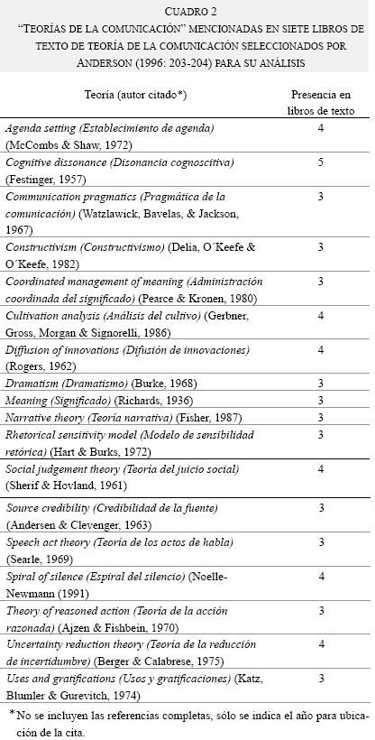 El mismo autor se sorprende de los resultados: entre las 18 "teorías de la comunicación" no hay representación de las teorías marxista, feminista o crítica. También están ausentes los estudios culturales, la hermenéutica, la teoría de la acción social y la teoría de la estructuración, al igual que el estructuralismo, el existencialismo, la fenomenología, la teoría de la ideología y la de la hegemonía. Pero nueve de las 18 "podrían ajustarse a alguna definición de cognitivismo" (ibidem: 202), y el resto se pueden reconocer como "accionales" y "discursivas" (ibidem: 217). Sólo por curiosidad, pues la consistencia epistemológica de las teorías no es el objeto de este trabajo, en el cuadro 2 se citan las 18 "teorías de la comunicación" identificadas por Anderson en los siete libros de texto analizados.