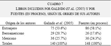 Debido a que el corpus de 140 libros de Galindo et al. (2005) clasifica pero no jerarquiza las obras incluidas, se seleccionaron las 148 más frecuentemente citadas en el corpus de Fuentes (incluyendo las que tuvieron 11 o más citas en las tesis) y se hizo de ambos conjuntos una división tripartita de los libros, según el origen de sus autores (extranjeros, iberoamericanos, mexicanos), que se muestra en el cuadro 7.