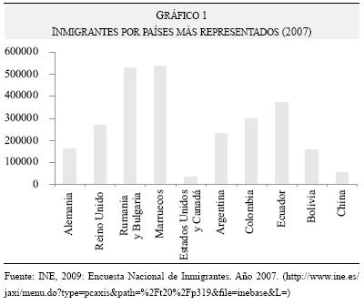 Los problemas de comunicación lingüística parecen, de esta manera, salvados en tanto que en las comunidades autónomas con idioma propio hubiera un bilingüismo entre la lengua autonómica y el español como lengua oficial del Estado, que permitiera usar el español como lengua franca por tales hablantes fuera de su comunidad autónoma.5 Sin embargo, desde los años noventa, España se transformó en un destino no transitorio de la migración internacional, lo que incrementó de modo no esperado la población extranjera residente. Esto llevó parejo el aumento de la diversidad lingüística con la llegada de población extranjera, pasándose de un contexto bilingüe de interrelación comunicativa a uno plurilingüe, e introduciéndose de modo notorio el factor cultural. Según la Encuesta Nacional de Inmigrantes del 2007, existen 12 nacionalidades con mayor representación en la población residente en España (gráfico 1). La población inmigrante representa casi 10% de la población total del país, concentrada sobre todo en áreas urbanas, lo que crea un abanico multicolor estimable. Las principales nacionalidades (>55,000 personas) son marroquíes, ecuatorianos, colombianos, bolivianos, británicos, alemanes, búlgaros y rumanos, lo que supone la presencia de idiomas de poco uso y conocimiento para la población española, como árabe, bereber, quechua, aimará, alemán, búlgaro y rumano. Aunque se pueda establecer el español e inglés como lengua franca, su conocimiento y manejo fluido no está garantizado por ninguno de los interlocutores.