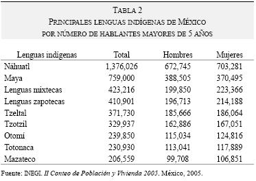 En este caso, el gran reto no lo impone tanto la inmigración como las minorías étnicas existentes en el país. Mientras que en Estados Unidos sólo la población indígena, continental e insular, supone 1% de la población (U.S. Census Bureau, 2000) del cual 30.2% no habla correctamente el inglés. En México, esa población representa, en 2005, prácticamente 7%, el cual mantiene un patrimonio lingüístico de 63 idiomas, de los que destacan por número de hablantes: náhuatl, maya, mixteco, zapoteco, tzeltal, tzotzil, otomí, totonaca y mazateco (tabla 2). De este 7% el porcentaje de molingüismo es de 12%,9 cuya concentración a nivel regional es significativa en los estados de Chiapas, Yucatán, Oaxaca, Campeche, Quintana Roo, Guerrero, Puebla, Veracruz y San Luis Potosí.