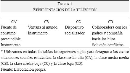 En los discursos de las familias de clase media-alta y media-media se percibe el medio como un instrumento al servicio de los telespectadores que reconocen hacer uso de la televisión para satisfacer necesidades de entretenimiento, de pasar el tiempo o de información. La diferencia que podemos apreciar entre la clase media-alta y la clase media-media es en el grado de abstracción que manifiestan con relación a la televisión. Para la clase media-alta el medio es una fuente de consumo absolutamente prescindible y para las familias de clase media-media la televisión no deja de ser un instrumento, pero necesario como ventana al mundo. Para las clases medias-bajas la televisión es un dispositivo socializador; asumen los criterios sostenidos por la televisión como fundamentos morales o pautas de conducta. Las familias de clase baja, ven en el medio a una aliada; una compañía en el caso de padres o madres sin trabajo o como una colaboradora en el cuidado de los hijos, que en muchas ocasiones y a edades muy tempranas dejan solos en el hogar frente al televisor.
